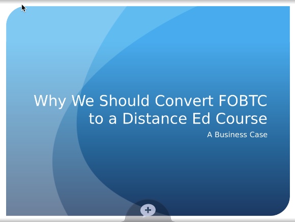PRESENTATION – Why We Should Convert FOBTC to a DE Course – I have always been a strong proponent of being able to convert traditional in-class courses to DE courses. For this assignment, I argued the benefits of transitioning a course at my job to a DE coaurse. Here is the link. I used a program called VoiceThread. I found it an innovative way to create a presentation. Link – https://voicethread.com/share/11199940/